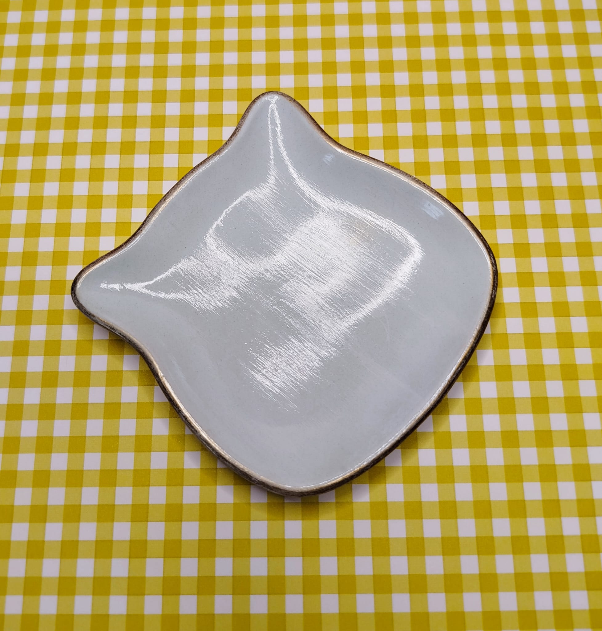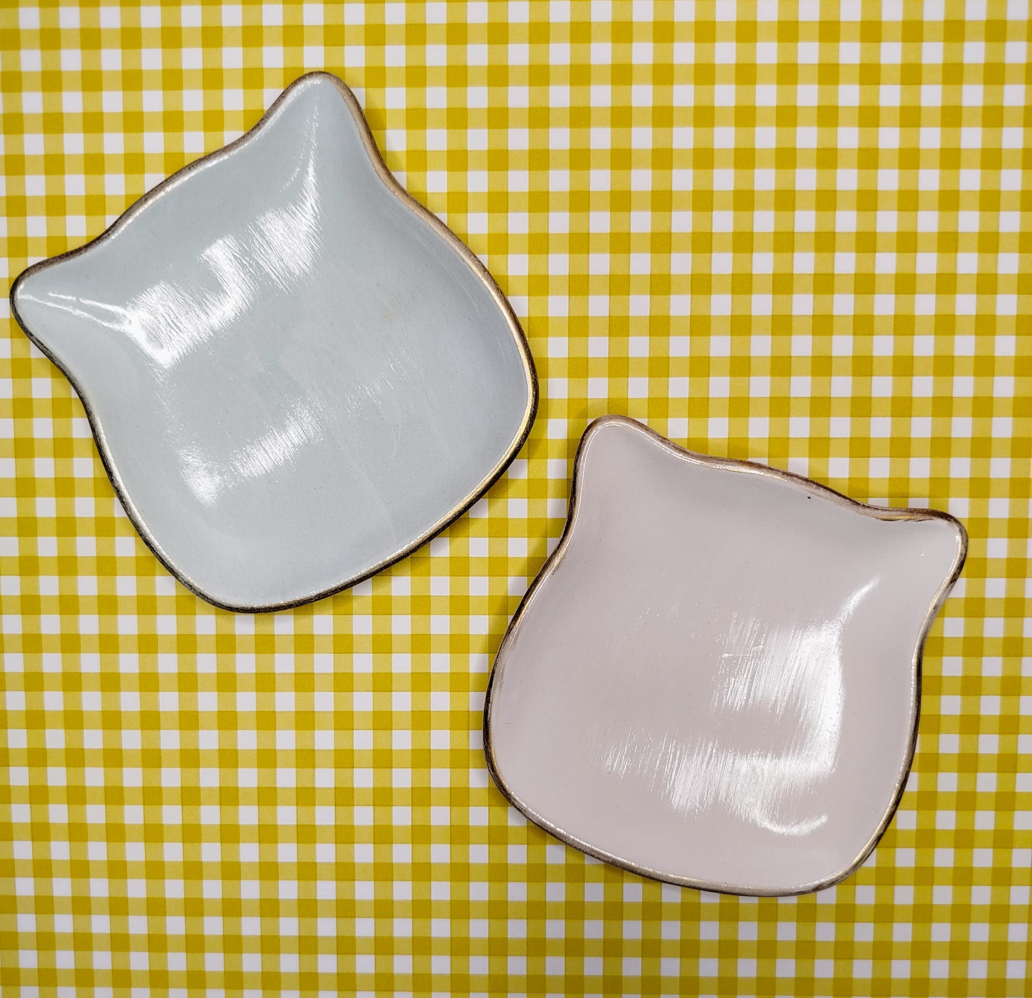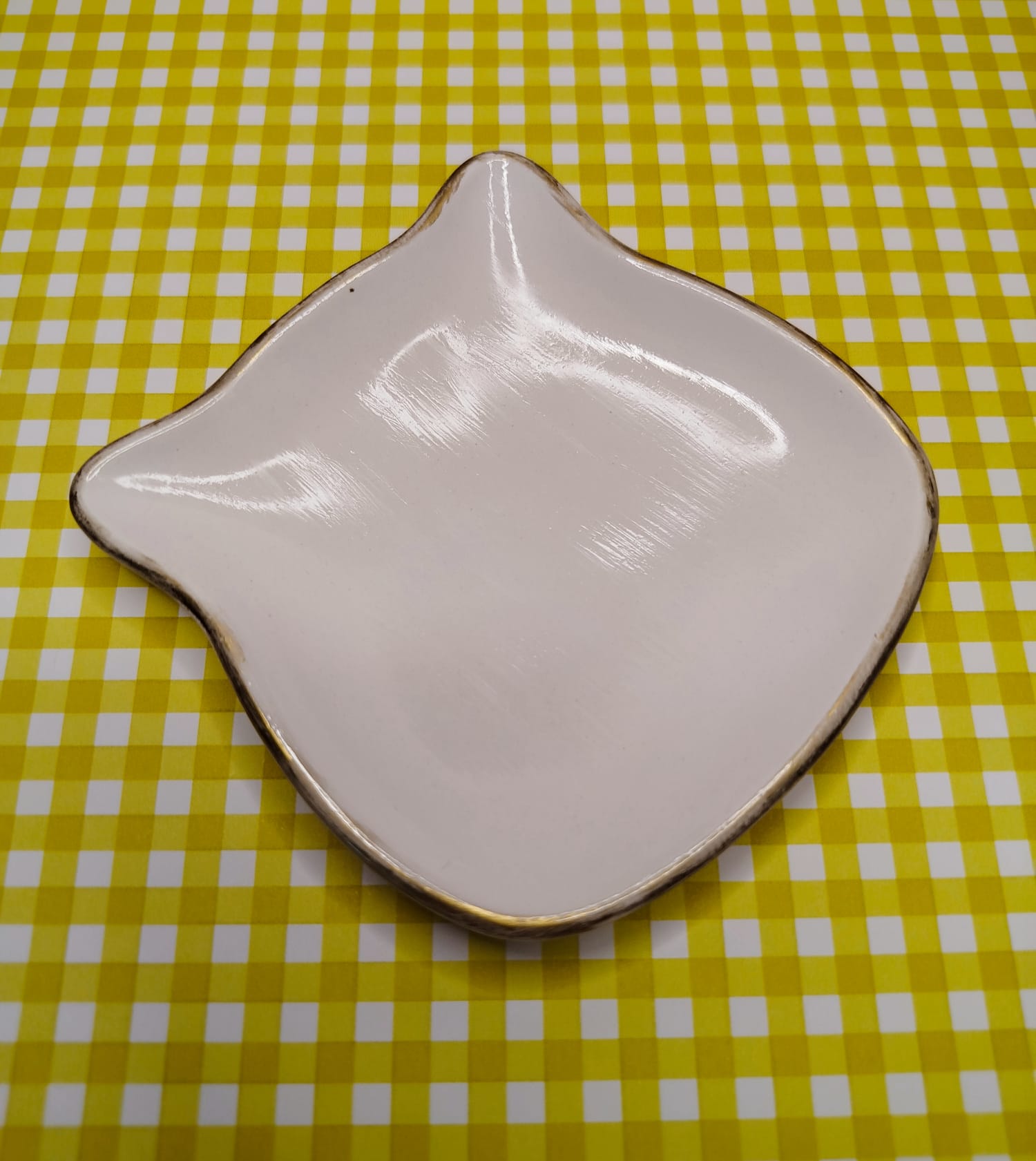 Hay objetos que nacen con un guiño en su forma. Esta bandeja artesanal de cerámica, con la silueta delicada de un gato y sus orejas en punta, recuerda a esas figuras entrañables que habitaban los hogares de antes: pequeños adornos en vitrinas, estampas en manteles bordados, o gatos de porcelana que cuidaban silenciosamente cada estancia.