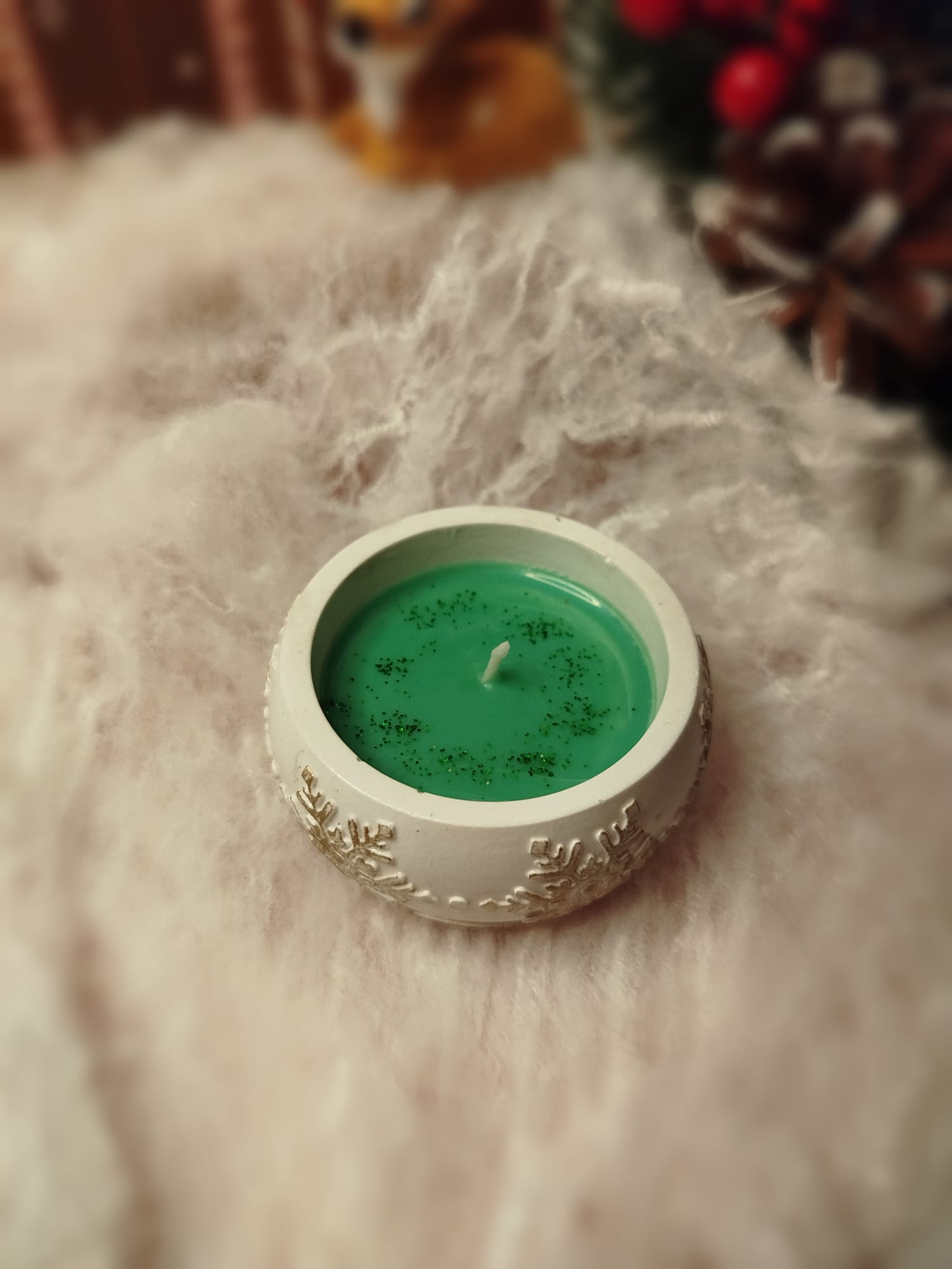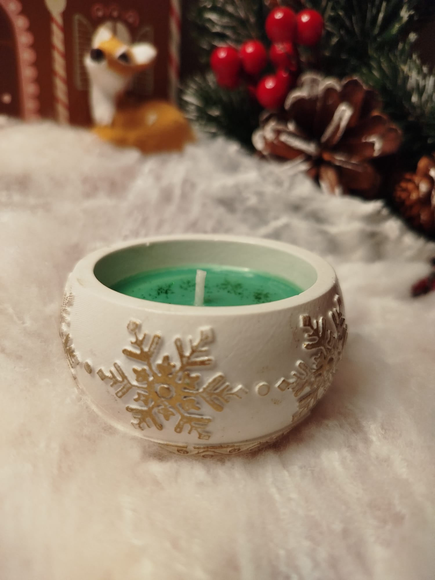 Material: cera de soja natural + recipiente de cerámica con relieve de copos de nieve