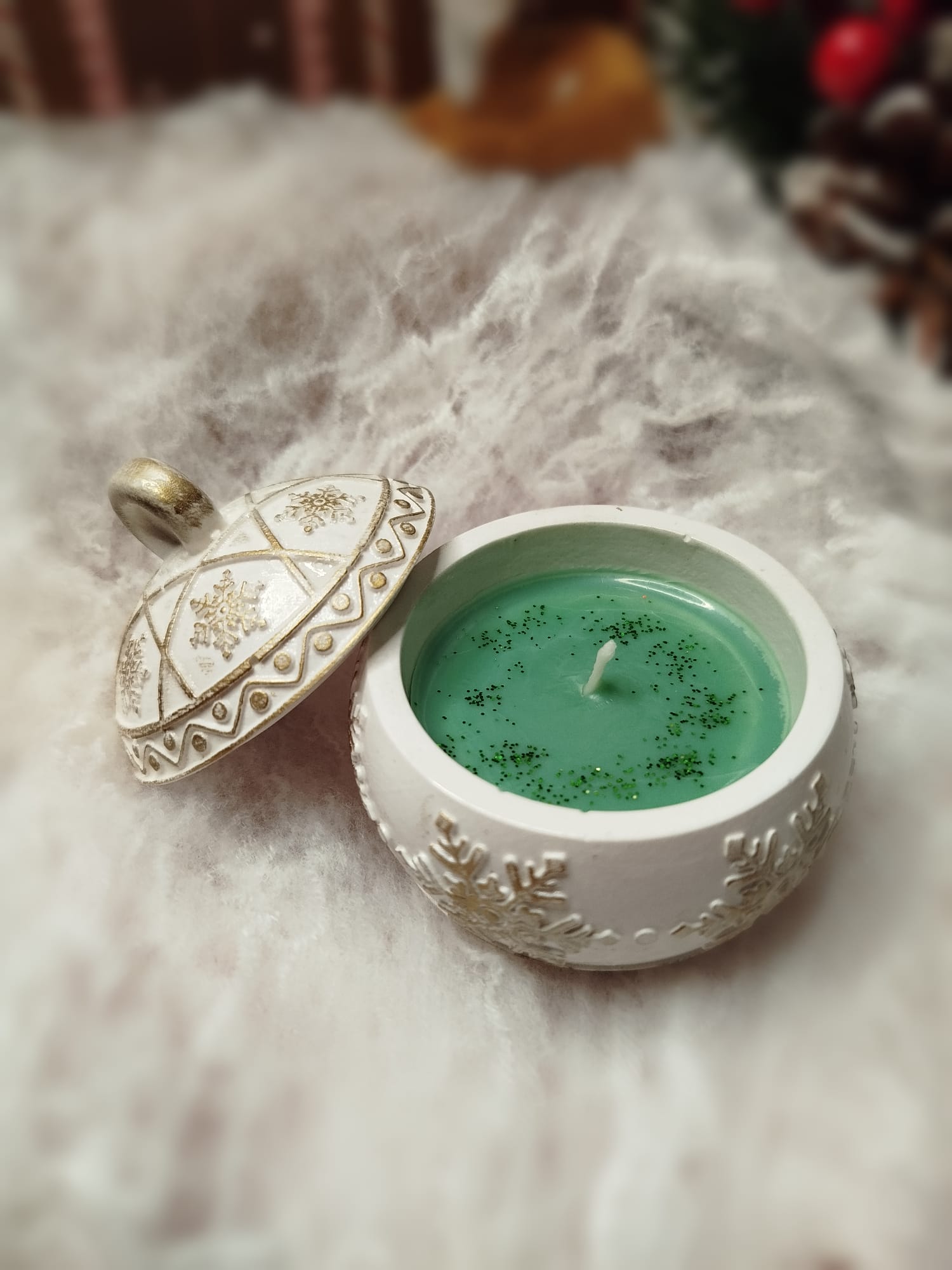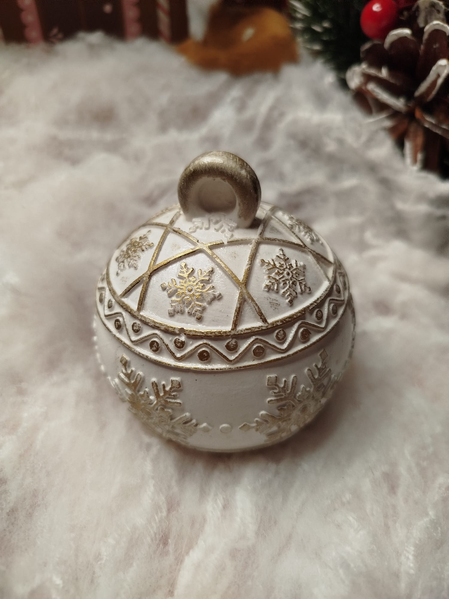 Hecha a mano con cera de soja 100% natural, se presenta en un recipiente de cerámica en forma de bola navideña, decorado con delicados relieves dorados.