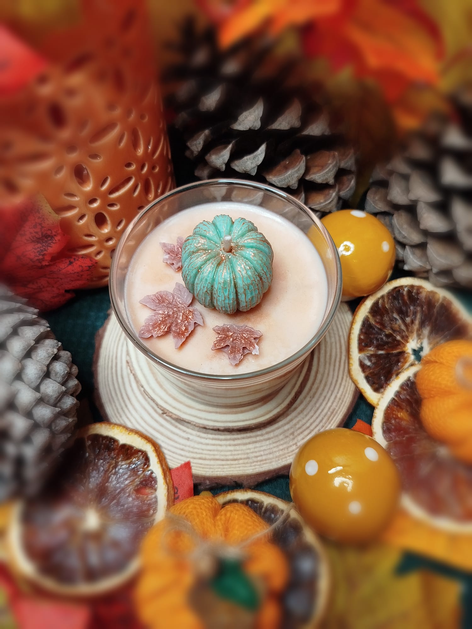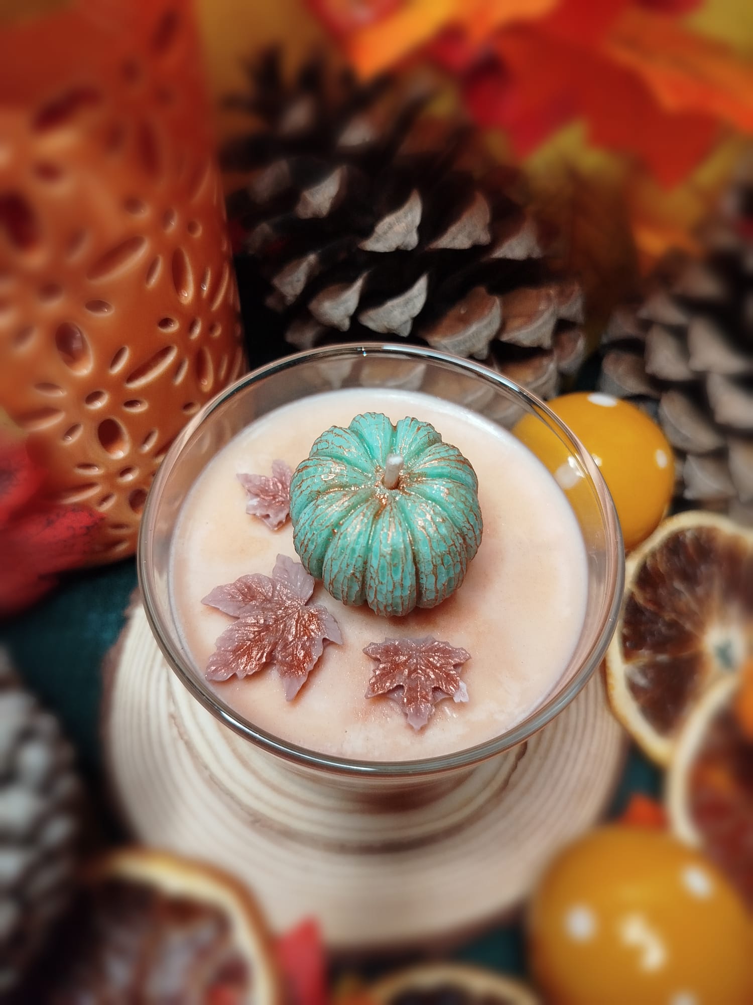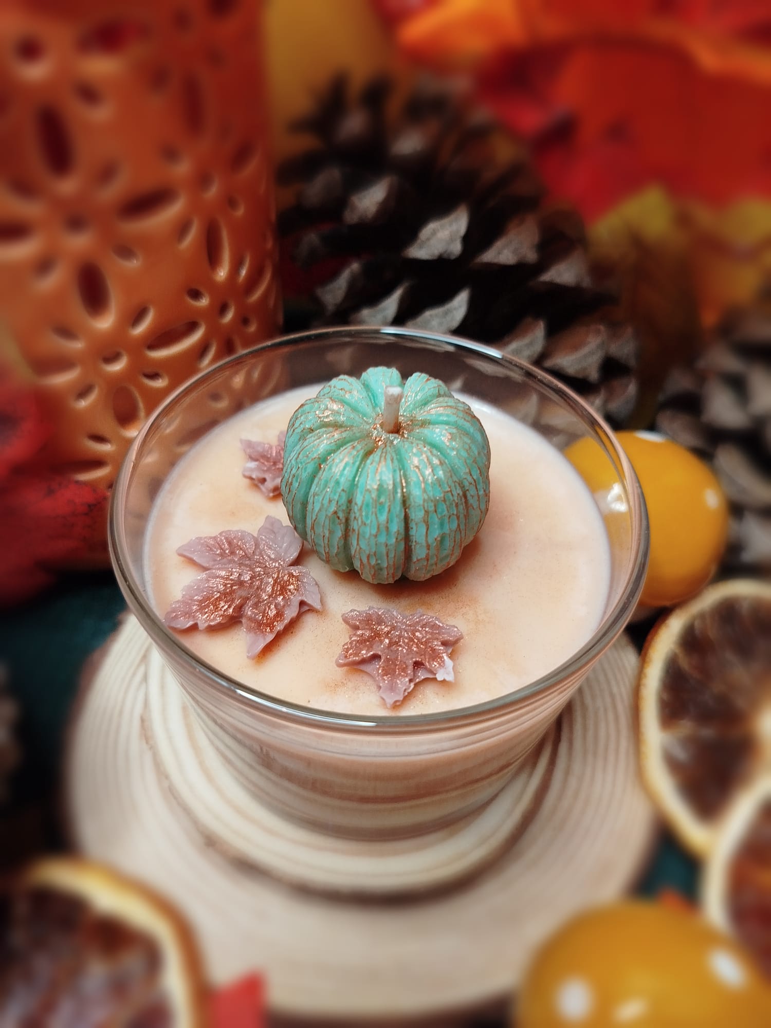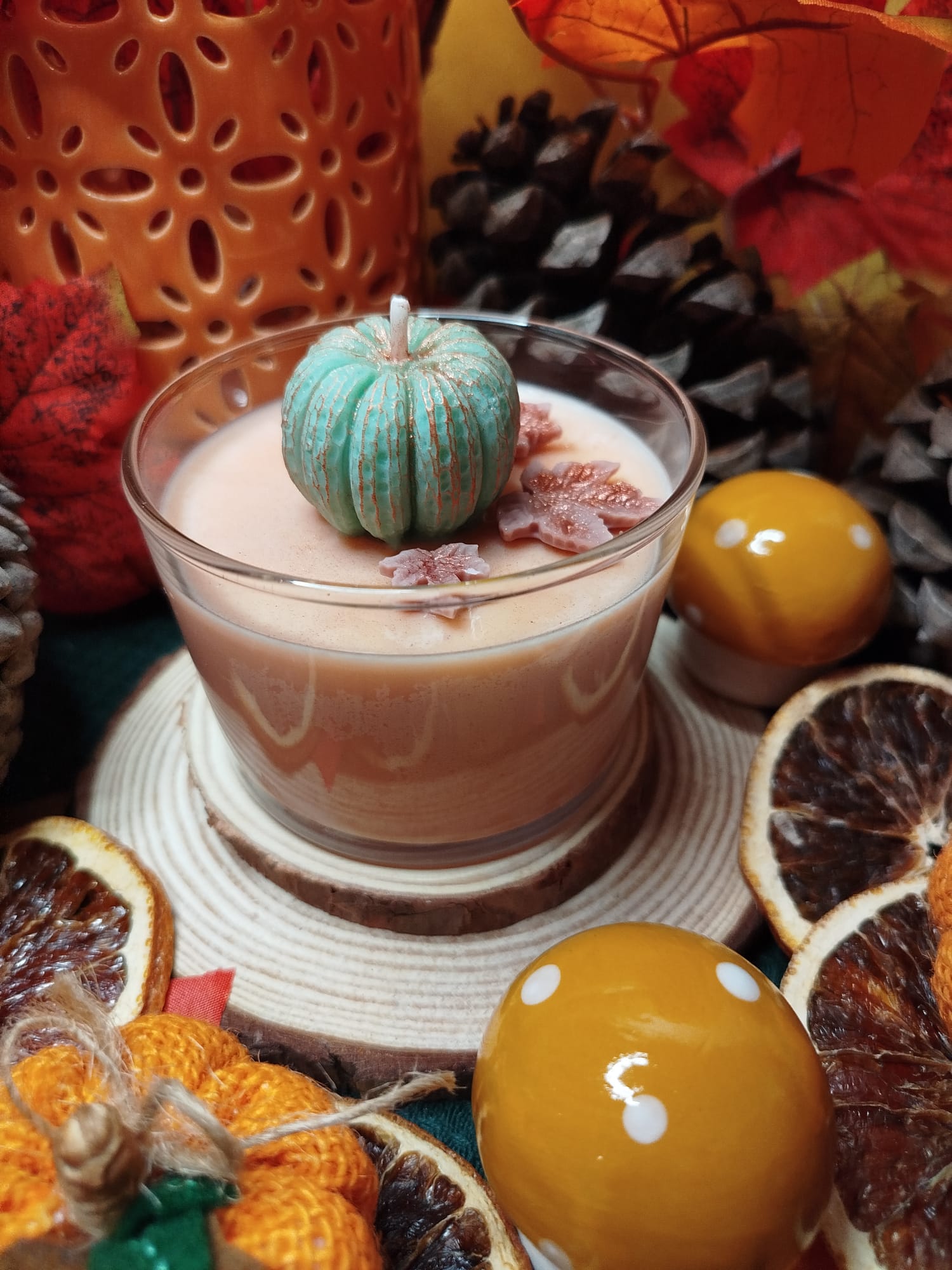 Elaborada a mano con cera de soja natural, cada pieza lleva una mini calabaza y hojas otoñales creadas en cera, que hacen de ella un pequeño paisaje de estación. Su fragancia combina notas de calabaza, canela y vainilla, despertando recuerdos de cocina casera y tardes en familia.