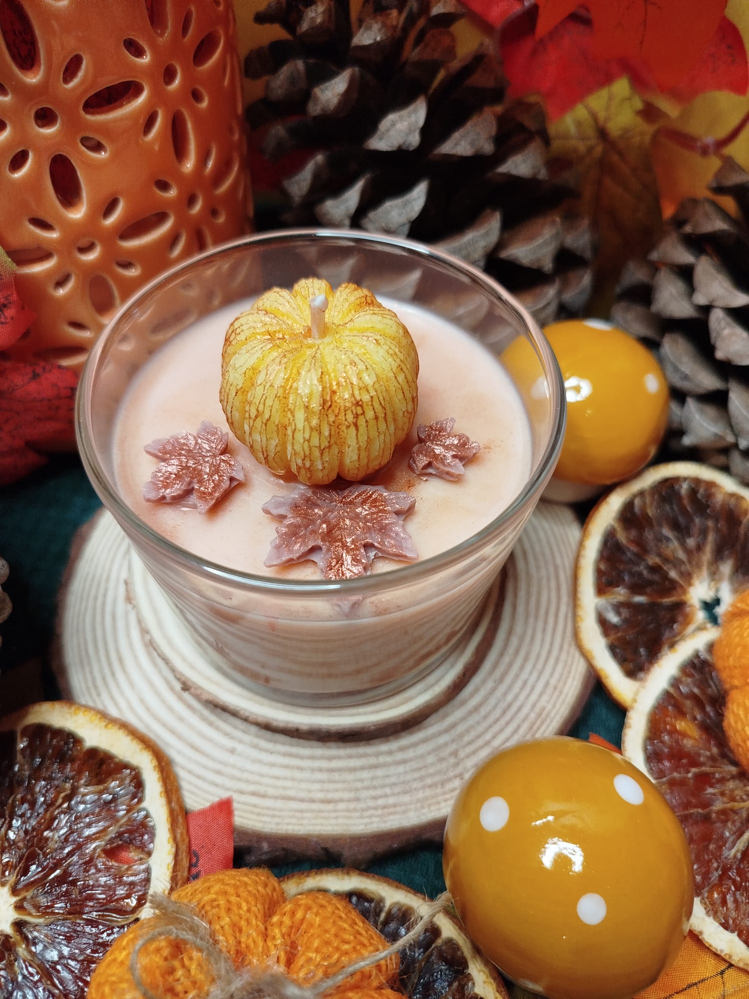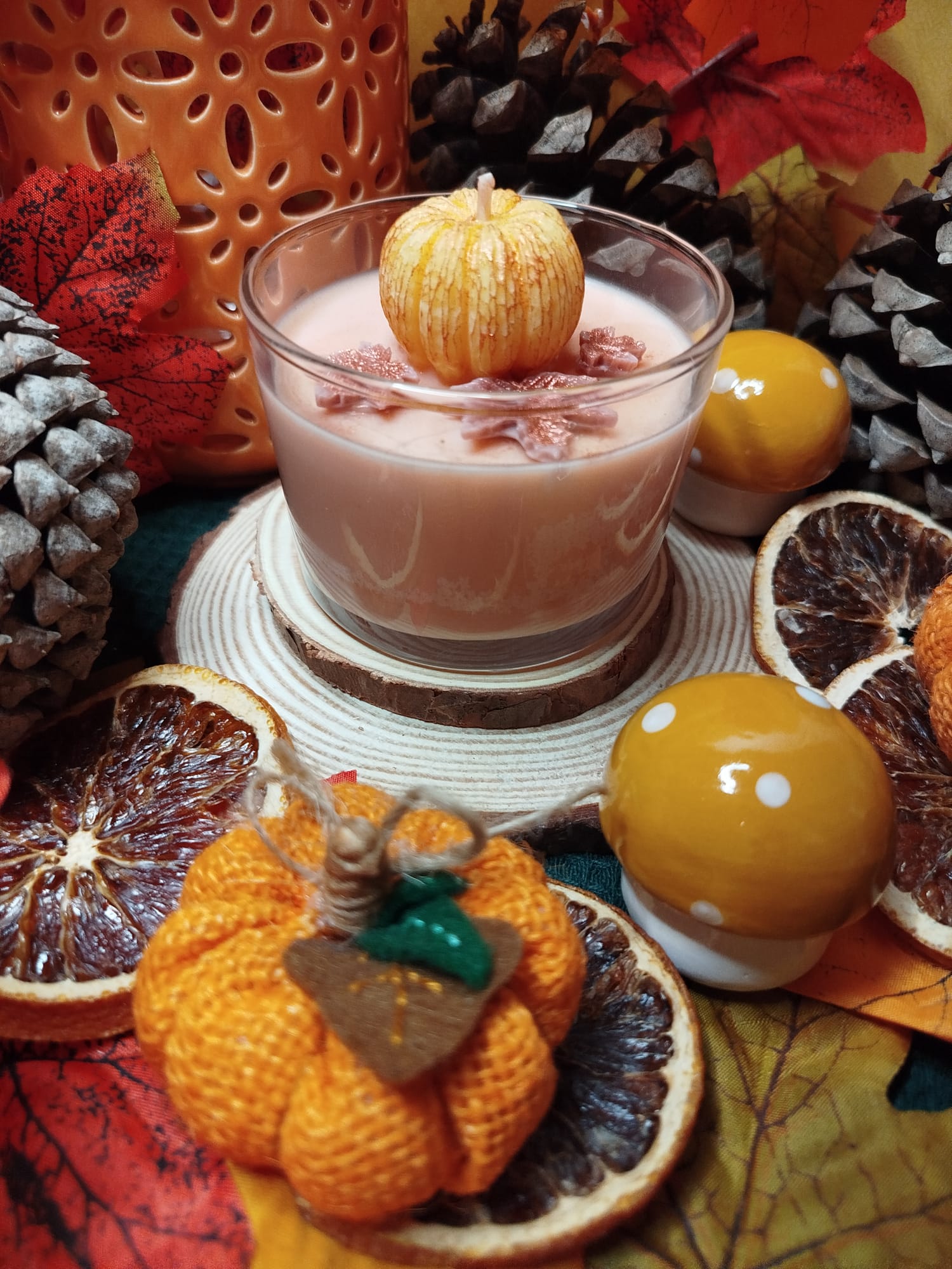 Elaborada a mano con cera de soja natural, cada pieza lleva una mini calabaza y hojas otoñales creadas en cera, que hacen de ella un pequeño paisaje de estación. Su fragancia combina notas de calabaza, canela y vainilla, despertando recuerdos de cocina casera y tardes en familia.